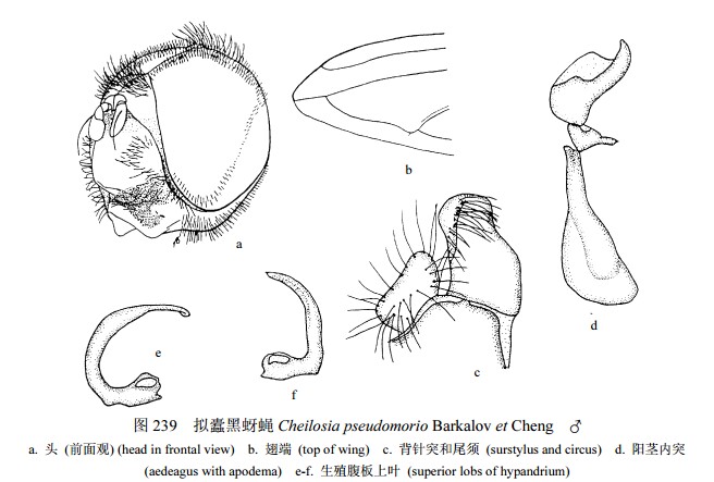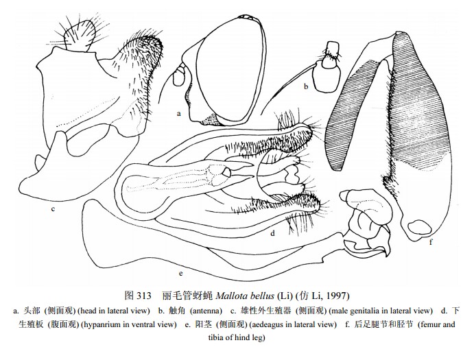 雄性 头顶平,覆黑毛;单眼呈等腰三角形;额平,密覆灰色粉被和黑色毛;颜狭,两侧几乎平行,上部黑色,下部褐色,覆薄粉被,中突非常宽,具光泽;眼缘狭,其最宽处明显狭于第3触角节的1/2宽,覆灰色粉被和白色短毛;颊非常低,粉被和毛同眼缘;新月片褐色。复眼裸,两眼连...