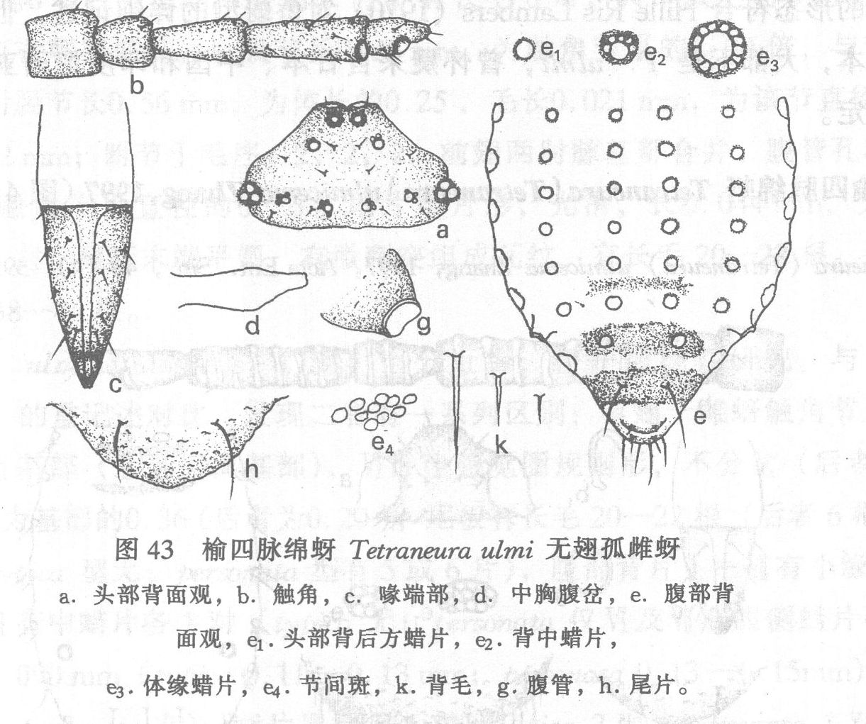 体长卵形,体长2.50mm,体宽1.10mm。活体深绿色。玻片标本淡色,中胸稍骨化橙黄色,触角节Ⅲ—Ⅴ端部、节Ⅵ中部和端部及粗刚毛基部漆黑色,腹管、喙、尾片、尾板及足淡色,跗节灰黑色。体表光滑有淡色瘤。体背毛头状,头顶2对...