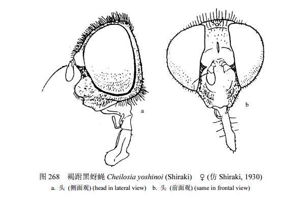 雌性 额蓝黑色,光亮,眼缘略被褐色粉被,具稀疏刻点;颜侧缘直,近下缘略宽,亮蓝黑色,除中突顶端和口缘外,被少量黄褐色粉被和褐色毛,侧面观在触角基部之下很凹入,中突尖;眼缘狭,被灰黄色粉被和黄色毛。复眼被褐色毛。触角黄褐色,第3节上缘褐色,长于基部2节之和,长...