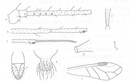 :体卵圆形,长2.46,宽1.70 mm,活体黄色,腹部腹面有薄粉。玻片标本头部与前胸分节明显,全黑色,胸、腹部淡色,腹部背片Ⅵ有中斑、Ⅶ有中侧斑,Ⅷ有宽横带,横贯全节;触角、喙、足各节、腹管、尾片、尾板、生殖板及生殖突黑褐色。体...