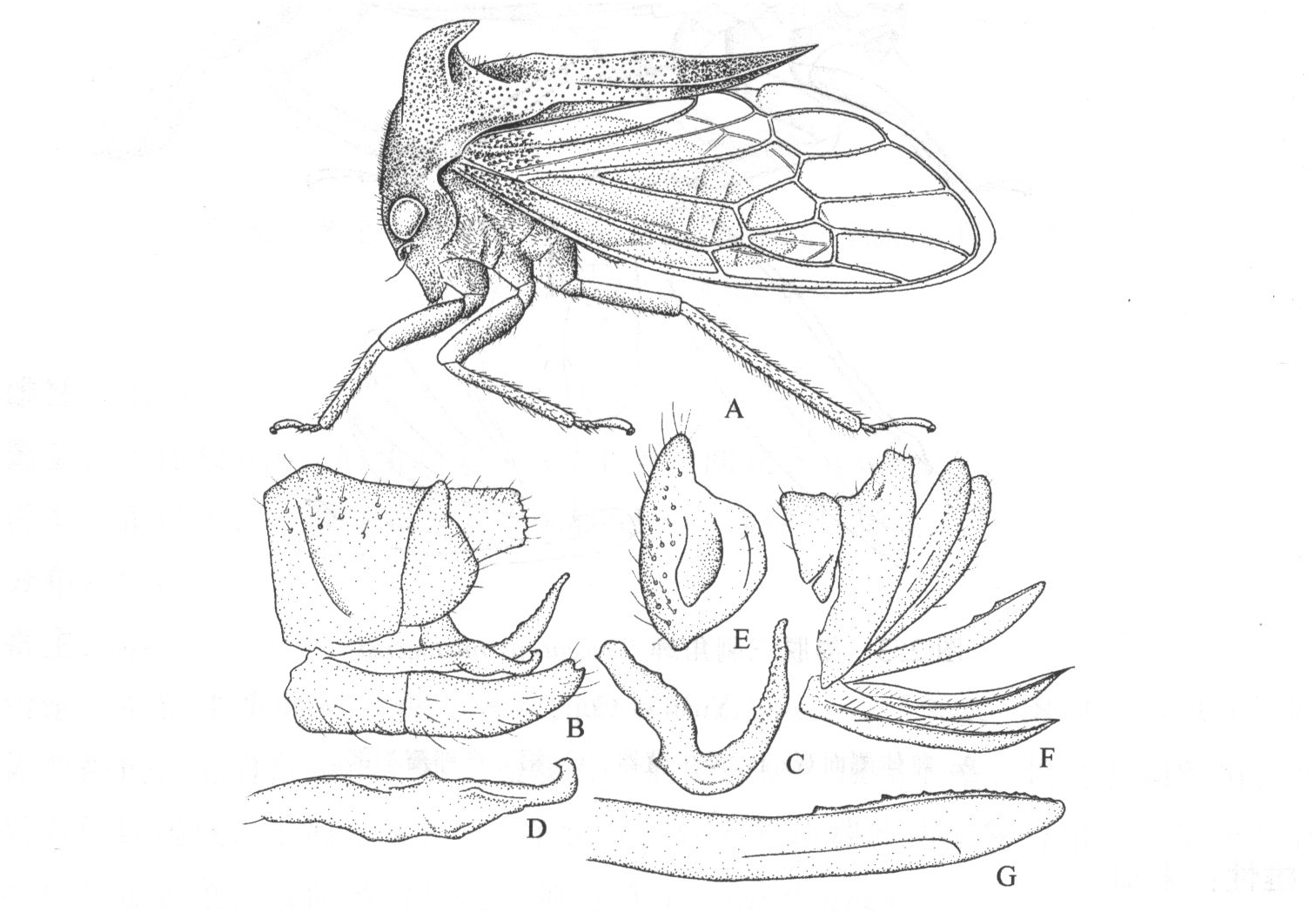 ,头顶上缘微弧形,下缘斜曲,边缘上翘。复眼大,黄褐色。单眼黄色,透明,位于复眼中心联线稍上方,彼此间距离等于到复眼的距离,额唇基