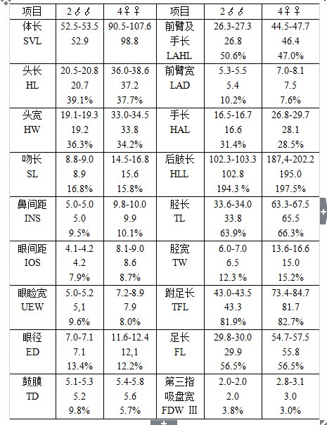 形态 依据西藏墨脱(59雄、3雌、7幼、卵及蝌蚪)标本。