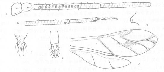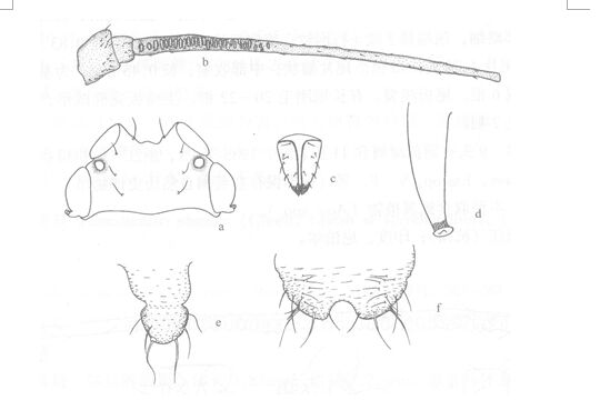 雄性 头顶三角黑色,被黄长毛;额正中污黑色,两侧密覆银白色粉被及少量白毛;颜黄色,密覆黄白色粉被,颜两侧及颊黑色,裸,颜中部在触角基部下方具黑斑。两眼短距离相接。触角褐黄色,较长,第3节短于基部2节之和,圆形;芒裸,与触角等长,褐黄色,着生在第3节背侧中部。...