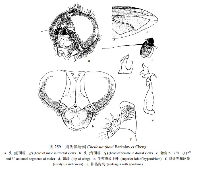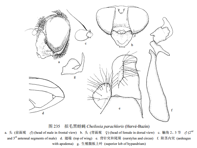 于长;芒黑褐色。中胸背板及小盾片亮黑色,被淡黄色长毛,背板两侧覆淡黄白色粉被;侧板黑色,覆淡黄白色粉被及黄白色长毛。腹部黑褐色,第2-5节背板各...