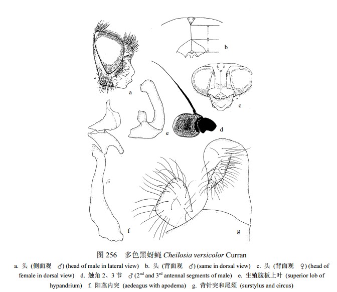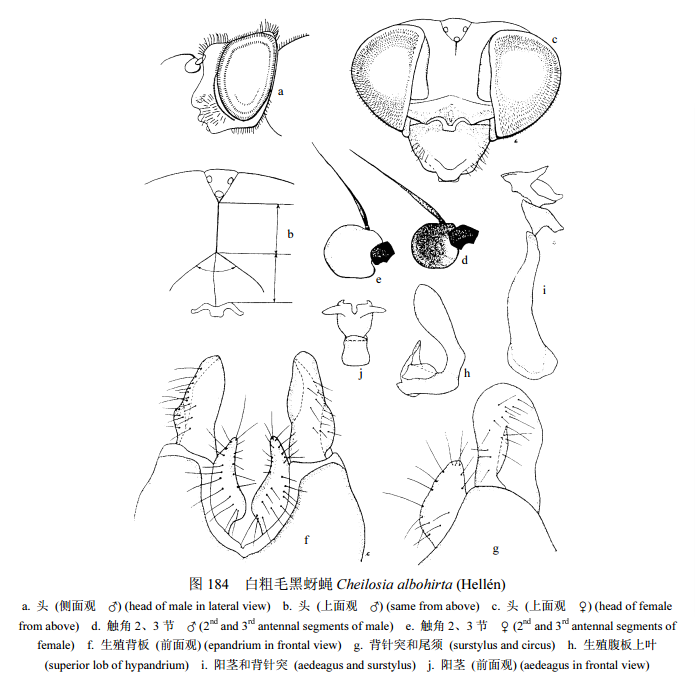 雄性 头顶隆起,长毛,黄色或黑色;单眼三角呈等边三角形;额明显隆起,被薄粉被和黑色长毛;颜宽,被灰色粉被和直立黑色长毛;中突小;眼缘宽,最宽处稍狭于触角第3节宽,被灰色粉被和直立黑色长毛;颊高,密被灰色粉被和白色长毛;新月片褐色;触角窝狭分开。复眼密被黄色长...