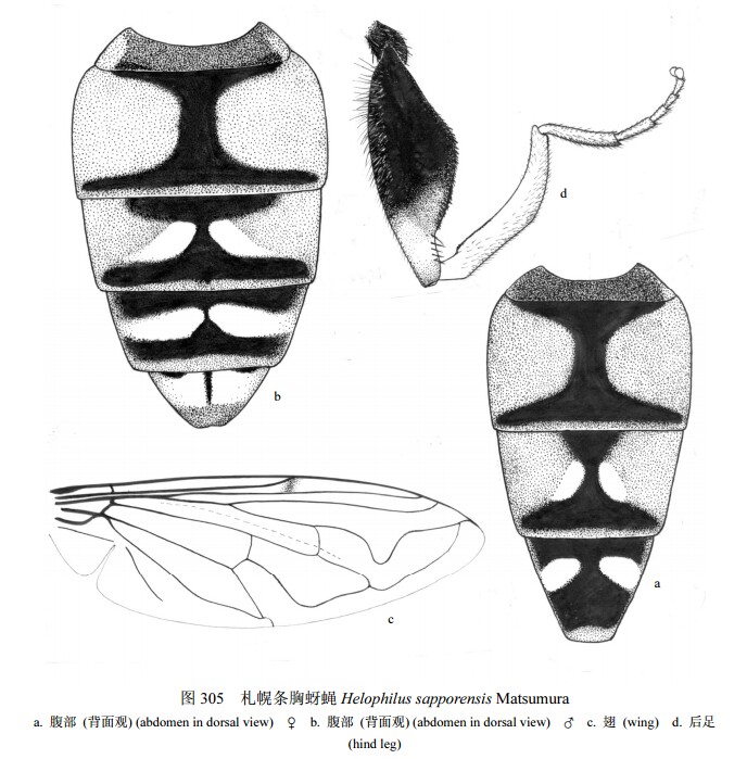 雄性 体狭长,亮黑色。头顶三角青黑色,具黄或棕色毛;额中部和颜中突亮黑色,其余覆黄或棕黄色粉被及棕色毛。触角棕黄色,第3节背侧略带褐色;芒棕色。中胸背板、侧板及小盾片亮黑色,被棕黄色毛。腹部狭长,长约6倍于宽;第2-4节背板各具1对黄斑;第2背板黄斑小,半圆...