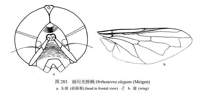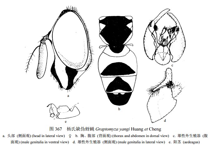雄性 头顶黑褐色;额两侧几乎平行,额宽为头宽的1/5,密覆棕黄色粉被和黄色毛,后部被黑色毛;颜密覆棕黄色粉被和黄色毛,正中棕褐色纵条裸,两侧下部黑色,裸。触角橘红色或棕黄色,第3节上缘略染暗色。中胸背板暗黑色,具黄棕色纵条2对,均达小盾沟,中间1对两端微宽,...