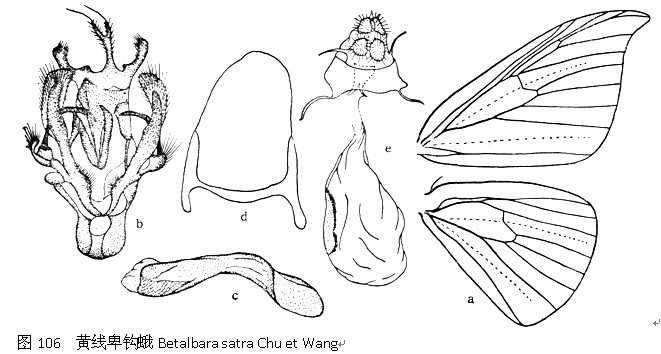 25—28mm。头污黄色,触角黄褐色,双栉形,肩板及胸部前缘黄褐色,间杂有白色及红色鳞粉,胸部及腹部淡黄色,有白色