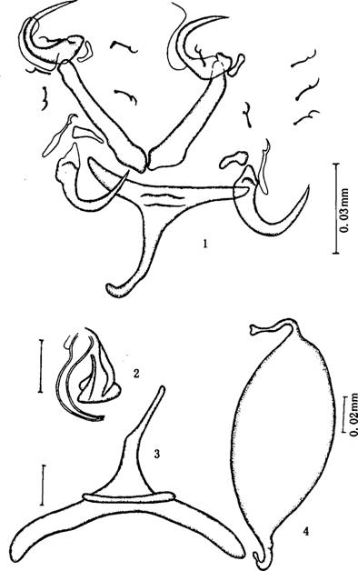 0.245__0.698mm,体宽0.047__0.1 72mm。体前端有分散色素粒。咽卵圆形,大小0.024×0.022__0.047mm。后吸器与体有明显区分,大小0.061一_0.1 23×0.078__0.1 67mm。边缘小...