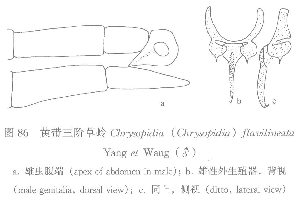 。头顶、胸腹部背面、腹面绿色,无立毛簇。♂后足胫节不膨大,♂♀2对距。♂第3腹节腹板有l对微弱刚毛斑。♂第8腹节背...