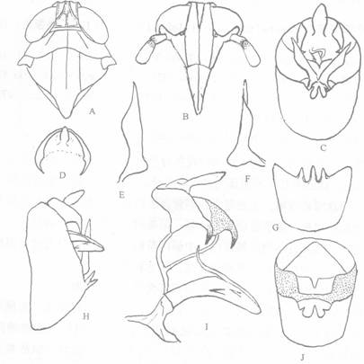 翅型雄虫:茶褐色,但前、中胸背板各脊及两侧缘淡黄色,触角第1节端部和第2节基部暗褐色,额区有几对不明显的淡色小圆斑,后胸侧板具暗褐色圆斑,前翅具淡褐晕几透明,端脉深褐微暗,无翅斑,腹部背面黑褐色,仅端部数节包括臀节和臀突色赭黄,腹部腹面茶褐色,尾节腹面黑色,...