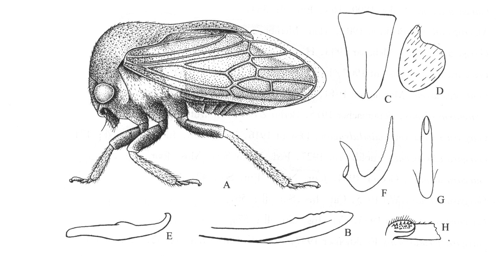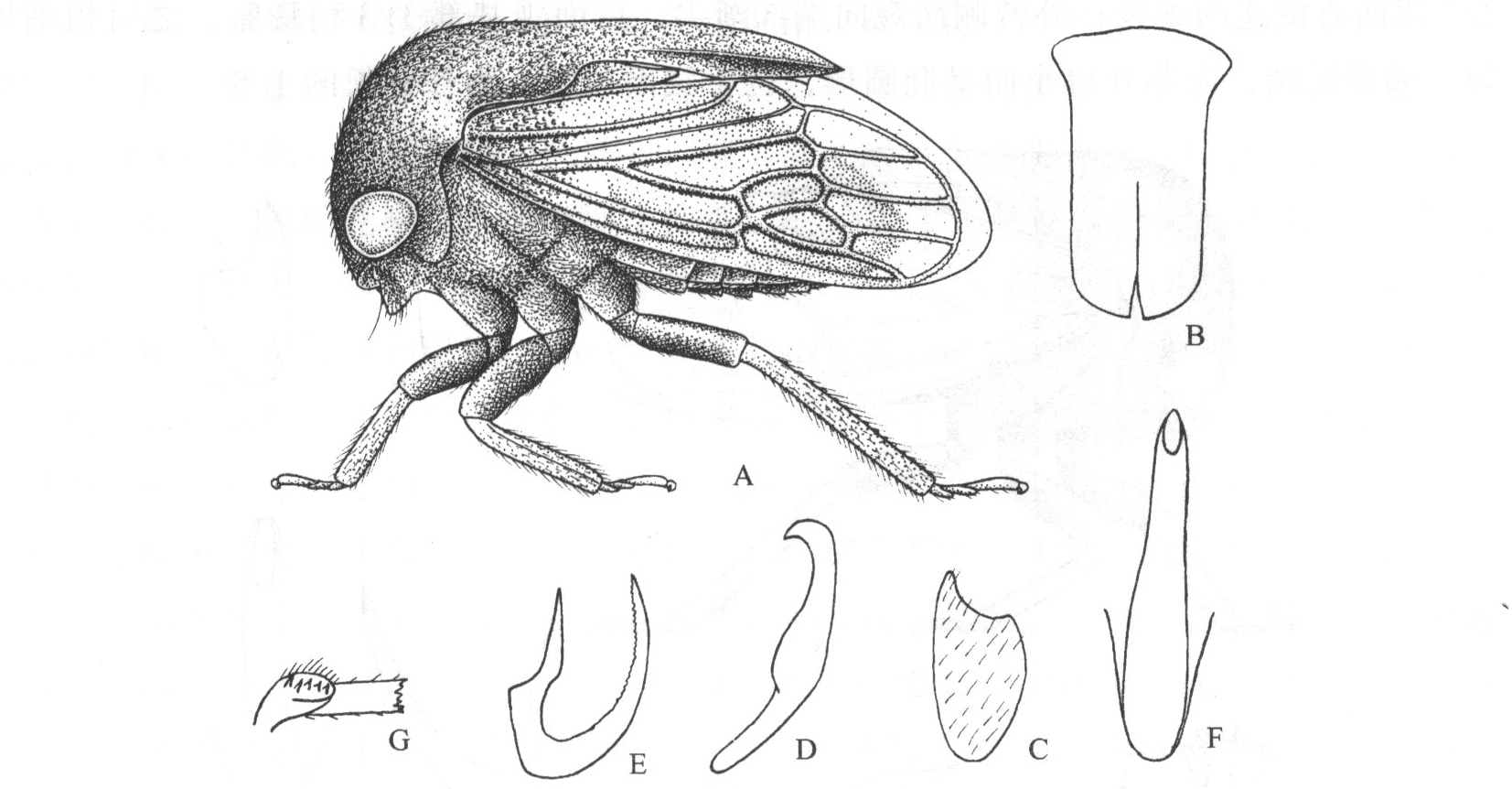 的l.3倍,基缘弓形,下缘倾斜,略呈波形,稍上翘。复眼褐色,卵圆形。单眼浅黄褐色,半透明,位于复眼中心联线稍上方,彼此间的距离为到复眼...