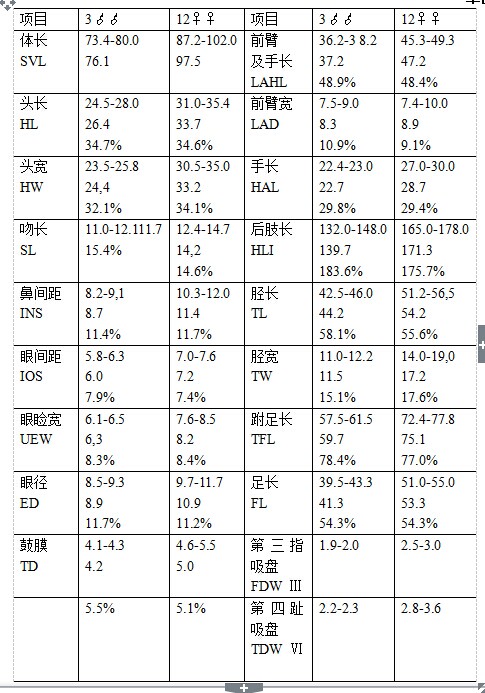 形态 依据四川筠连(3雄、14雌及3幼蛙);贵州毕节(2雄、3雌)标本。