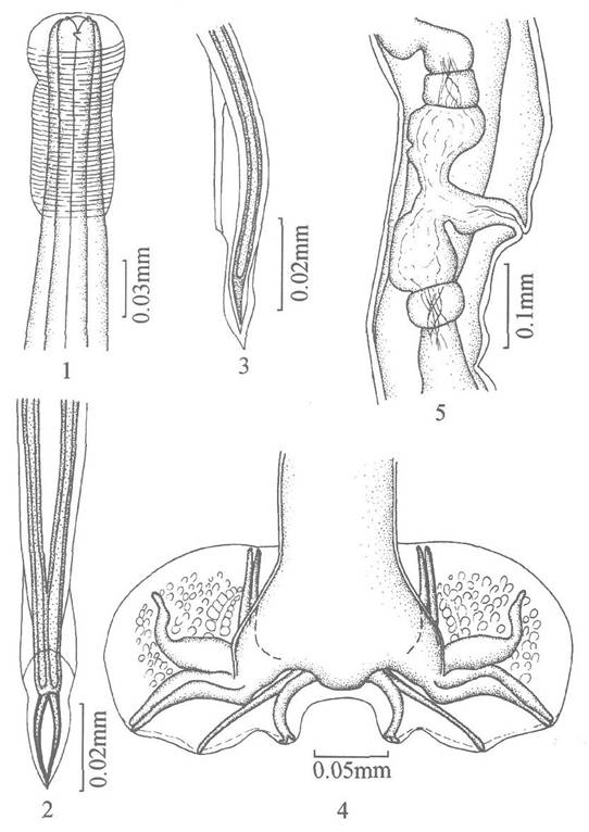 体前端有头泡,头泡后部角皮有横纹和纵纹。无颈乳突。口孔周围有数个不明显的乳突,无叶冠。口腔中有1个三角形的齿。