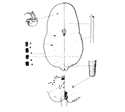 体细长如线,背腹扁平,前后两端钝尖如矢状。体全长为52.112,在肠叉处宽为0.668。口吸盘在身体前端,椭圆形,0.084×0.067。...