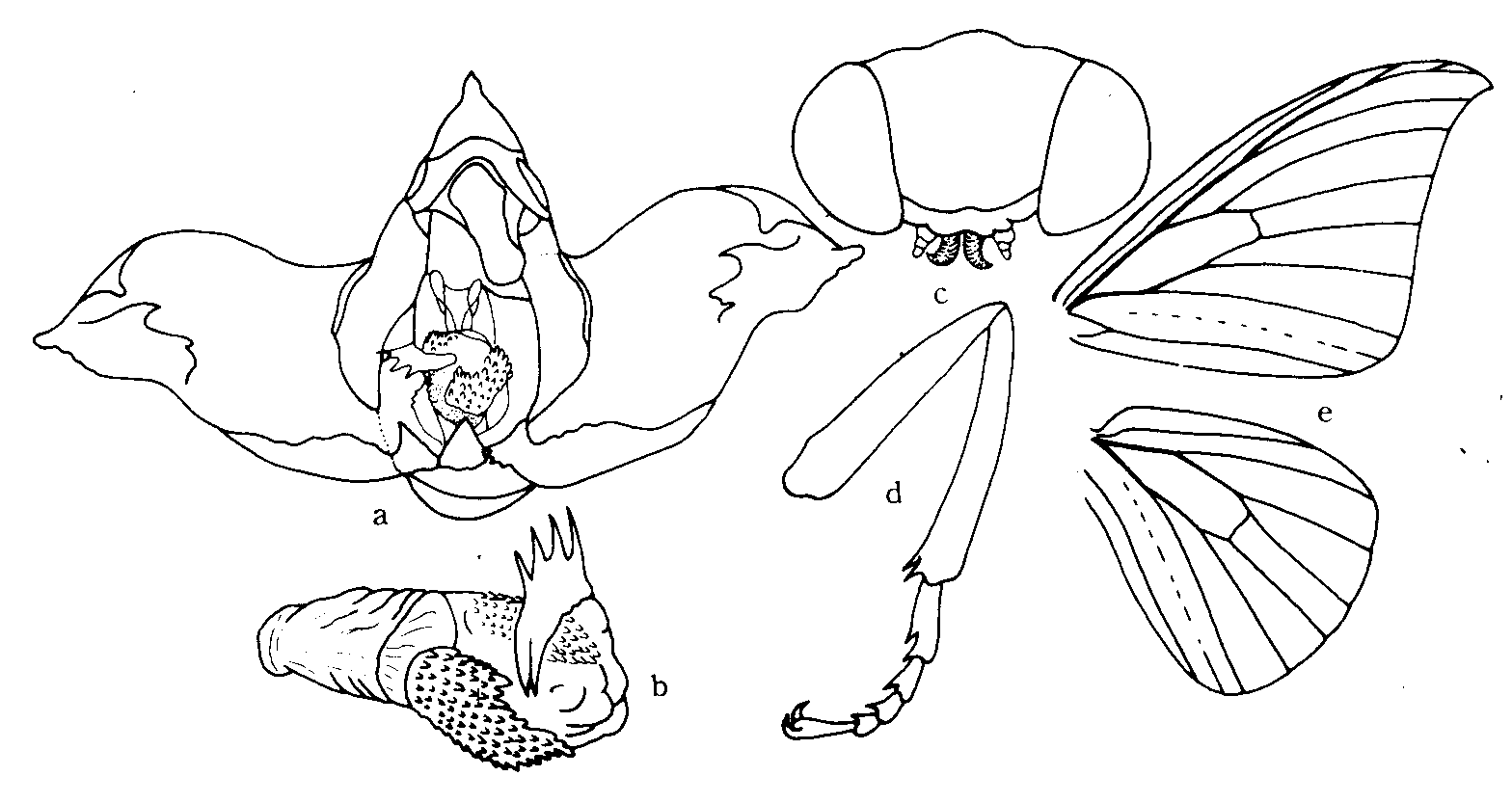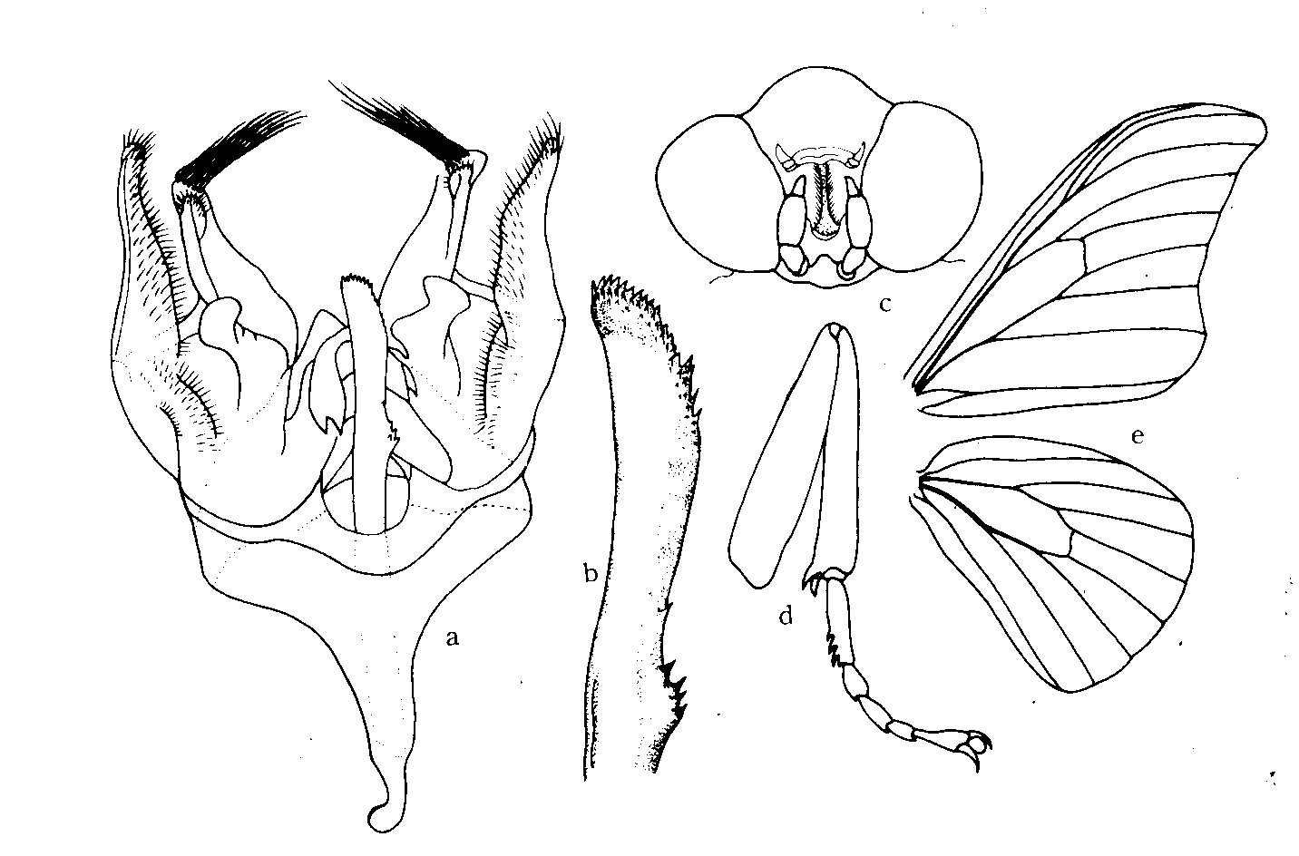 黄色毛;翅黄褐色有锈红色光泽,前翅内线赤褐色,呈大波浪纹,中线不见,外线棕色较直,自顶角内侧斜向后缘中部;顶角向外延伸,端部尖,自M3脉下方内陷,后角又外突,至使外缘呈弧形;中室端...