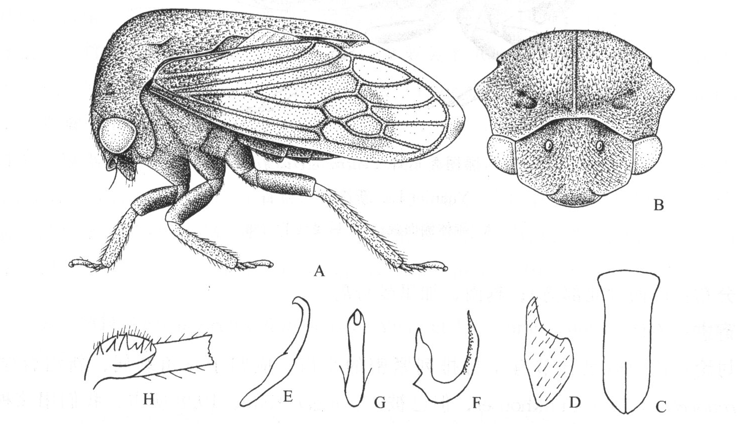 的1.3倍,基缘弓形,下缘倾斜,波形,略翘起。复眼浅褐色,圆形。单眼浅黄色,透明,位于复眼中心联线很上方,彼此间距离为到复眼距离的1.3倍。额唇基较短,其