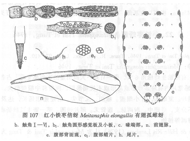 ):体椭圆形,长1.19,宽0.49mm。活体暗绿色。玻片标本头、胸部黑褐色,腹部淡色。触角、喙、足各节、尾板及生殖板褐色,尾片灰色。体背蜡片明显,头部背有2对,有时1对蜡片,各含2—5个,有时1个蜡胞,胸部背中1对透明...