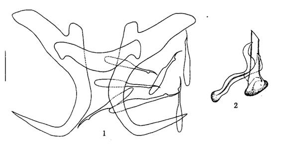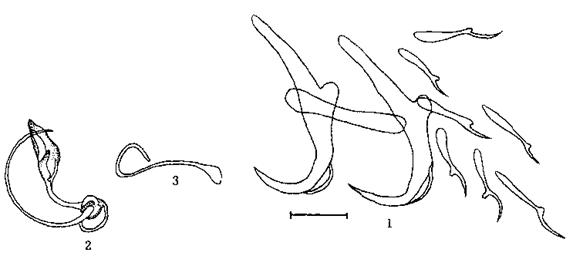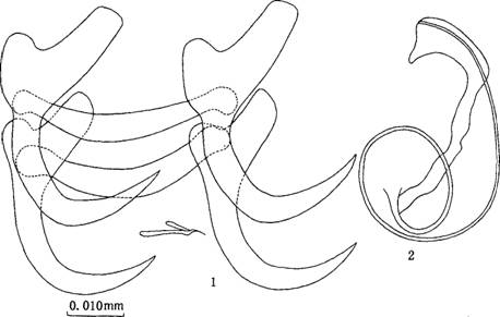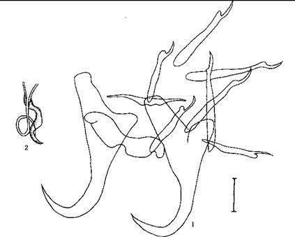 后吸器具二联结片。边缘小钩有明显区分的柄、柄轴及钩尖基突三部分,其长