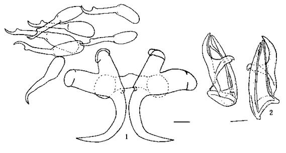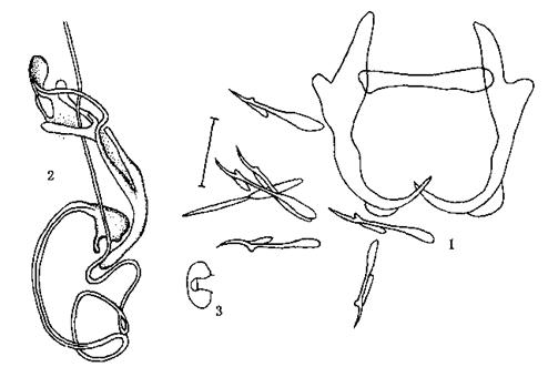 体分开不明显,联结片单一。边缘小钩一般形式,钩柄粗直,长0.037-0.045mm。中央大钩呈D,vasta...