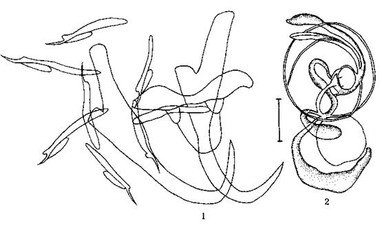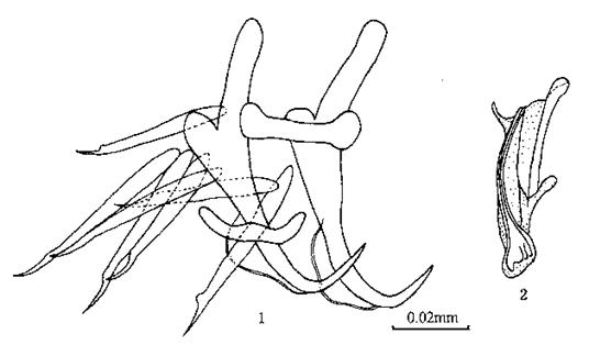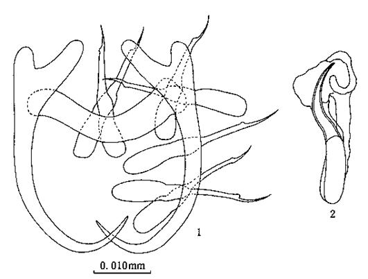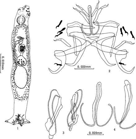 体区分不明显,大小为0.010-0.015×0.019-0.022mm。边缘小钩前3对发育完全,长0.029-0.036mm,钩尖长...