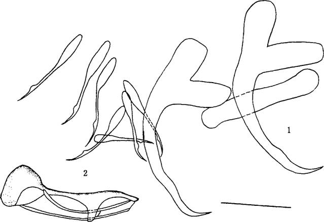 后吸器仅一联结片。边缘小钩具明显的柄,柄轴,及钩尖基突,其长0.019—0....