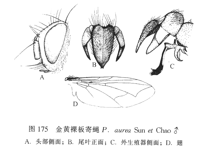 雄性 头部侧额、侧颜、胸部背面、腹部大部分覆浓厚的金黄色粉被,触角、下颚