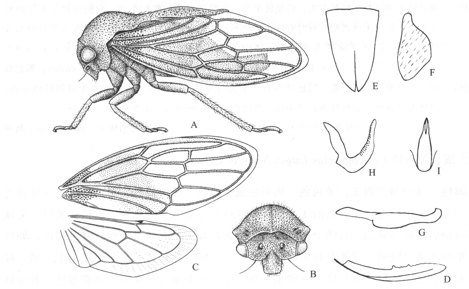 的l.5倍,基缘弓形弯曲,下缘稍倾斜,稍成波形。头顶中部及额唇基明显隆起,有的个体在两单眼上方各有一个疣状小突起。复眼褐色,卵圆形。单眼浅黄色透明,位于复眼中心联...