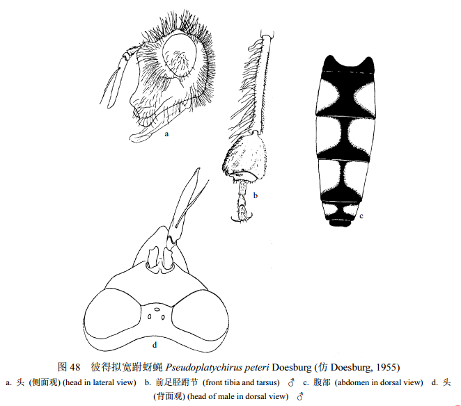雄性 头顶黑色,具暗褐色至黑色短毛;额黑色,覆棕色粉被,前部毛黄色,后部毛黑色;颜亮黑色,两侧下部变宽,覆黄色粉被及黄白毛,中突裸;后头粉被银白色,顶部毛棕色,下部毛白色。触角棕黑色,第3节红棕色;芒黄色,基半部为羽状毛。中胸背板暗黑色,密被金黄色至棕黄色长...