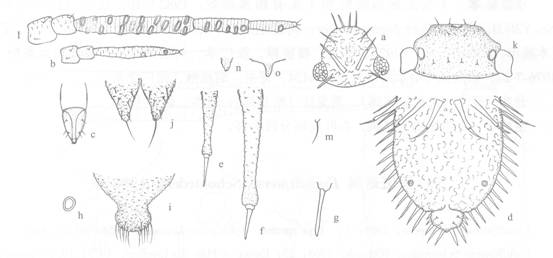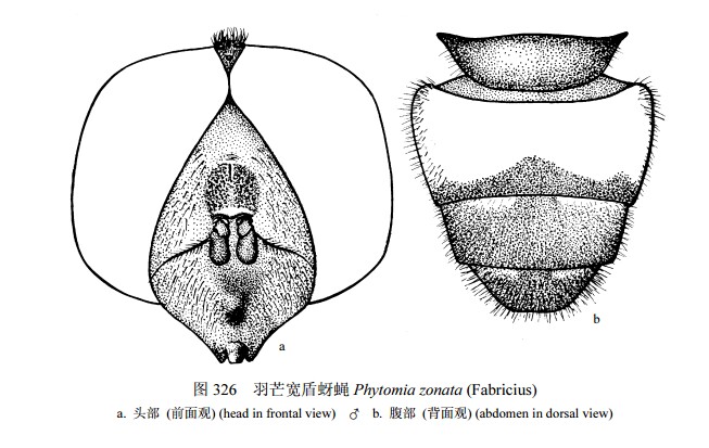 ,两眼宽分开,被白色长毛。触角黑色,第2节短,第3节极长,被暗黄色粉被;芒粗壮,不达触角的顶端。中...