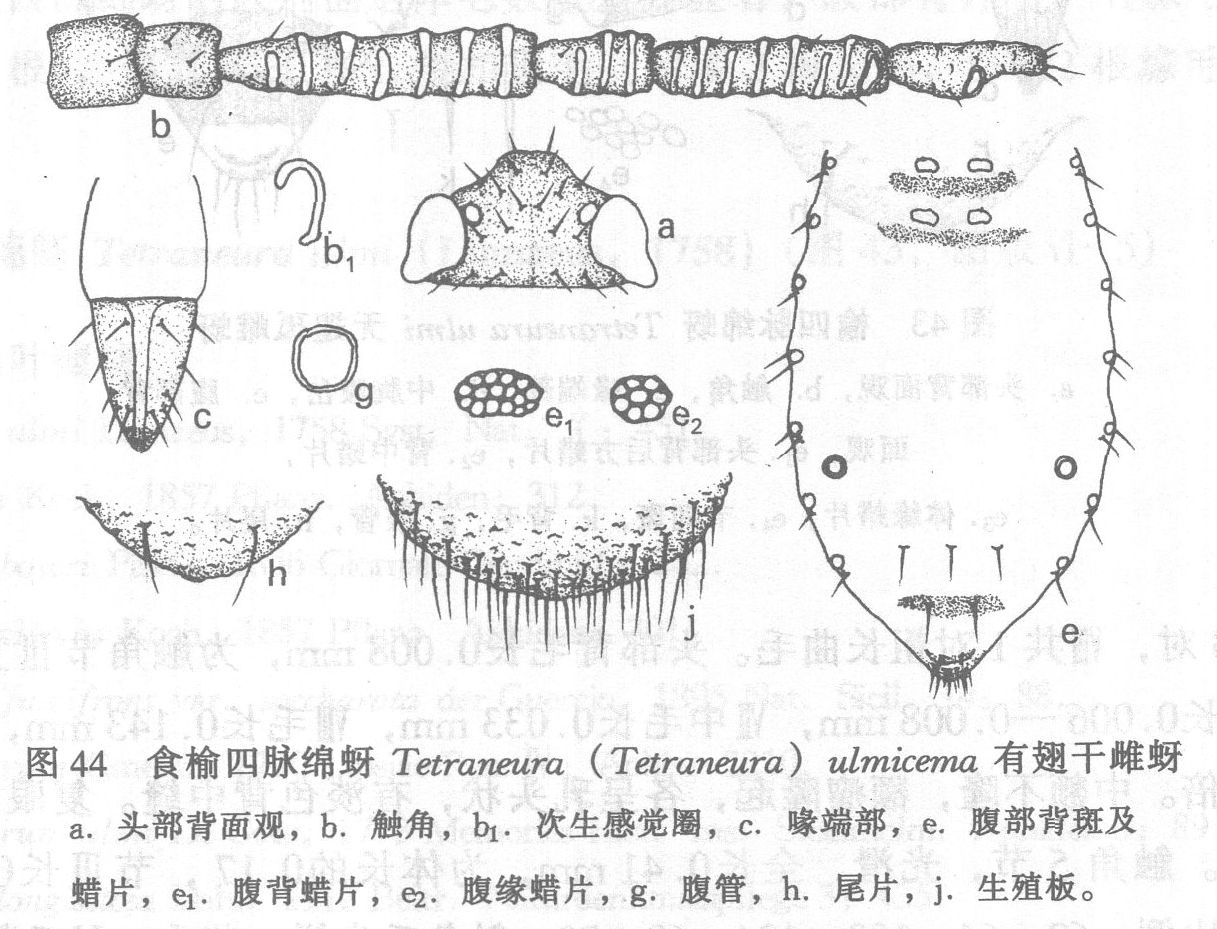 体椭圆形,体长1.43mm,体宽0.77mm。活体黄色或黄绿色。玻片标本淡色,无斑纹,触角淡色;喙端节褐色,顶端黑褐色;足淡色,胫节及跗节淡褐色;腹管、尾片及尾板淡色,尾片有时褐色。体表粗糙,体背有环纹,缘域及头背面有纵横...