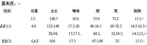 峰 43—49,翅203—211,尾63—71,趾蹠37—41毫米(♂)。