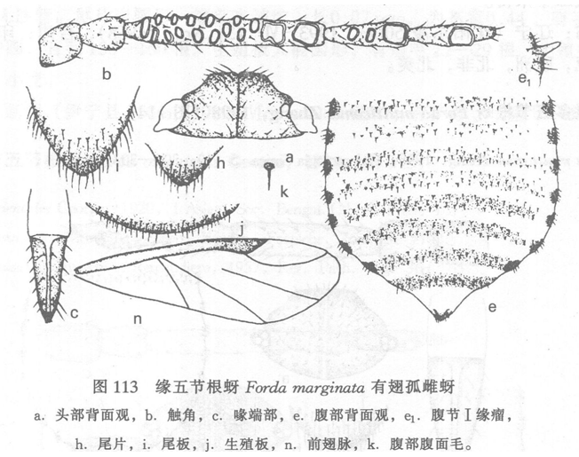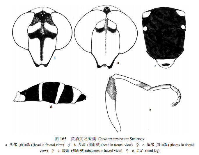 雄性 额黄色,前端褐色;颜最宽处为头宽之半,黄色,正中黑纵条达触角基部下方,宽为颜宽的1/4-1/5。触角黑色,第3节长于基部两节之和;芒棕黄色。中胸背板黑色,具明显刻点,中部具1对不明显的灰色纵条,两侧黄色纵条较宽,纵条在盾沟处断裂;小盾片全黄色;侧板黑色...
