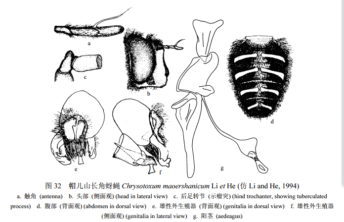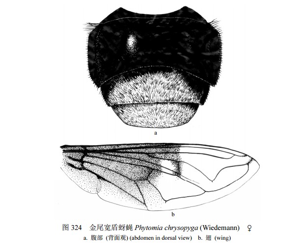 雄性 头顶三角黑色,覆淡黄色粉被和黄毛;额淡黄色,被黄色长毛,前端混有黑短毛;颜黄色,正中纵条淡褐色,或仅中突淡棕色,两侧黄色毛较长。复眼裸。触角黑色,第3节长于基部两节之和;芒淡褐色,约等于端部两节之和。中胸背板黑色,略具绿色光泽,覆淡色粉被和棕黄色毛,正...