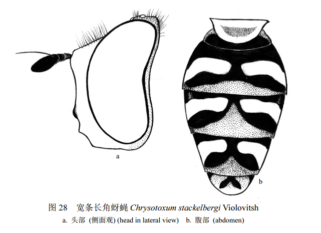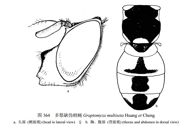 雄性 头顶和额黑色;额两侧近乎平行,前部毛黄色,后部黑色;颜正中黑色纵条达触角基部,颜两侧下部黑色宽,口缘黑色,除黑色部分裸露外,其余密覆棕黄色粉被及淡色毛;颊黑色,粉被灰色。触角黑色,第3节棕黑色;芒远较触角长。中胸背板黑色,具4条淡色纵条,正中2条达小盾...