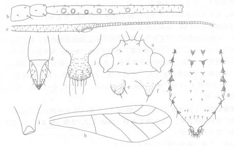 雄性 触角第3节较宽;芒短,明显短于触角第3节。中胸背板长宽相等。腹部第1节全黄色;第2、3节侧斑短小,该侧斑约为中斑的1/2宽。翅侧纹不明显,中断,狭。