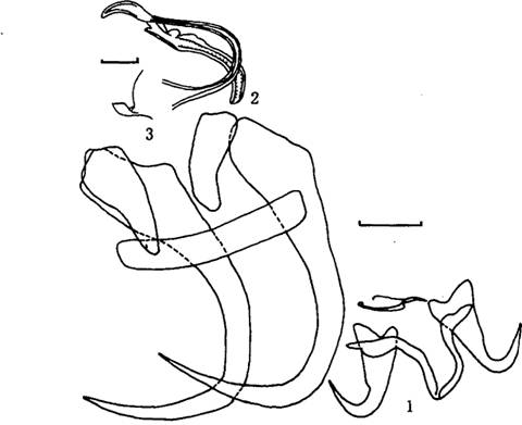 0.450mm,体宽0.150mm。边缘小钩7对,雏型;