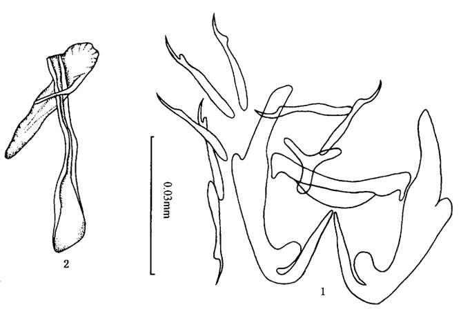 后吸器具二联结片,边缘小钩粗肥,具有明显的钩尖基突,但柄及柄轴不显,其