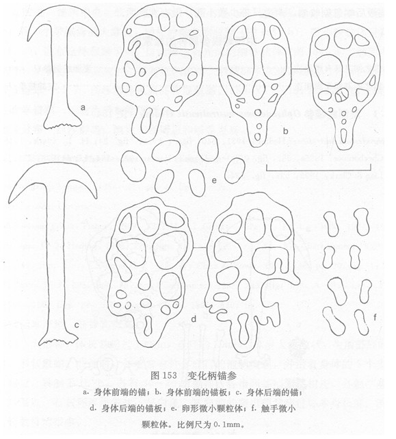 皮肤内的骨片有锚、锚板、穿孔板和颗粒体。锚形骨片是歪的,两