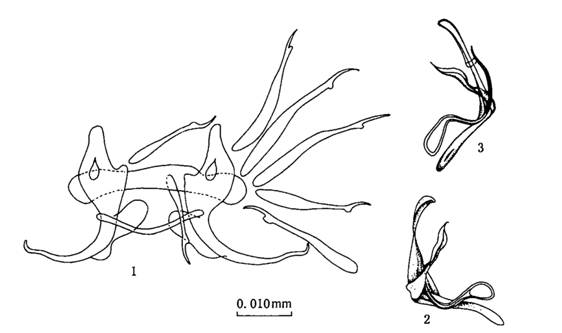 边缘小钩全长0.015—0.032mm。中央大钩全长0.028—0.032mm,基部长0.023—0....