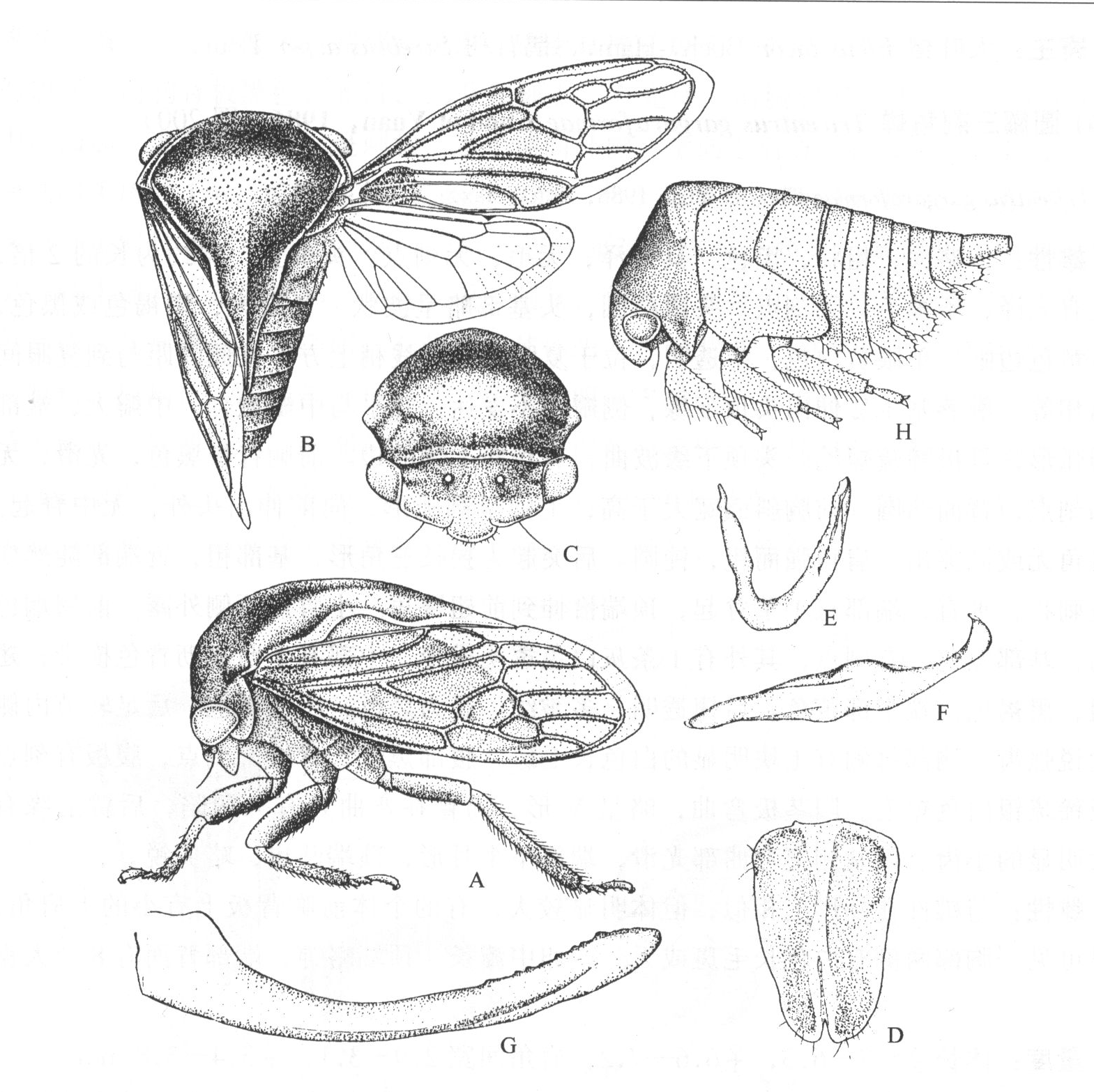 的2倍,黑色有光泽,不被毛,无刻点。头顶凸圆,头基部略呈波状。复眼大,黑褐色或黑色,有浅黄色边眶。单眼黄白色,半透明,位于复眼中心联线稍上方,彼此间距与到复眼间距离相等。额唇基l/2伸出头顶下缘,...
