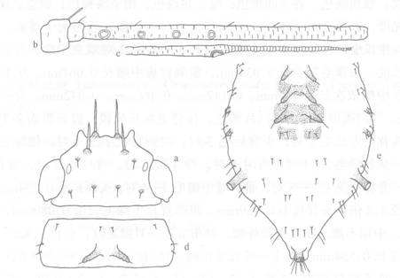:体卵圆形,长2.48,宽1.95mm。活体金黄色,玻片标本头部黑色,胸、腹部淡色,腹部背片Ⅶ、Ⅷ各一宽横带,Ⅷ带横贯全节,毛基斑不显;触角、喙、足各节、尾片、尾板及生殖板黑褐色。体表粗糙,头背有粗刺突布满,腹部背片及腹面尤其背...