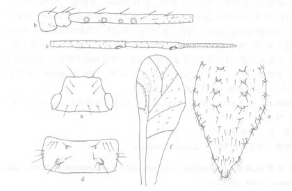 于宽,下缘直,上缘弯曲,顶角圆;芒黑褐色,短于触角,基部2/3加粗。胸部黑...