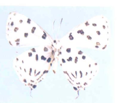 角斑黑色。翅反面白色,斑点黑褐色,前翅亚缘有小点1列,翅面不规则分布圆点7个;后翅基半部也有圆点7个,端半部有短线,平行排成2列,臀角及cu1室各有圆点1个。
